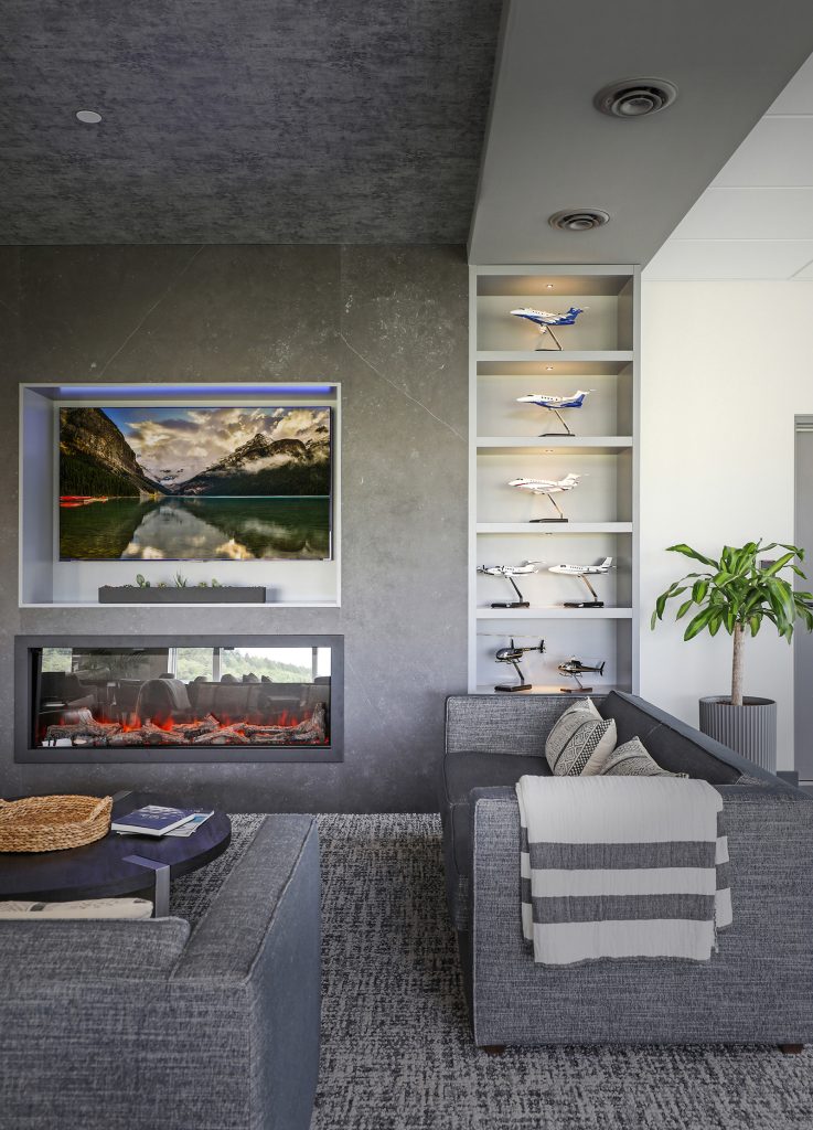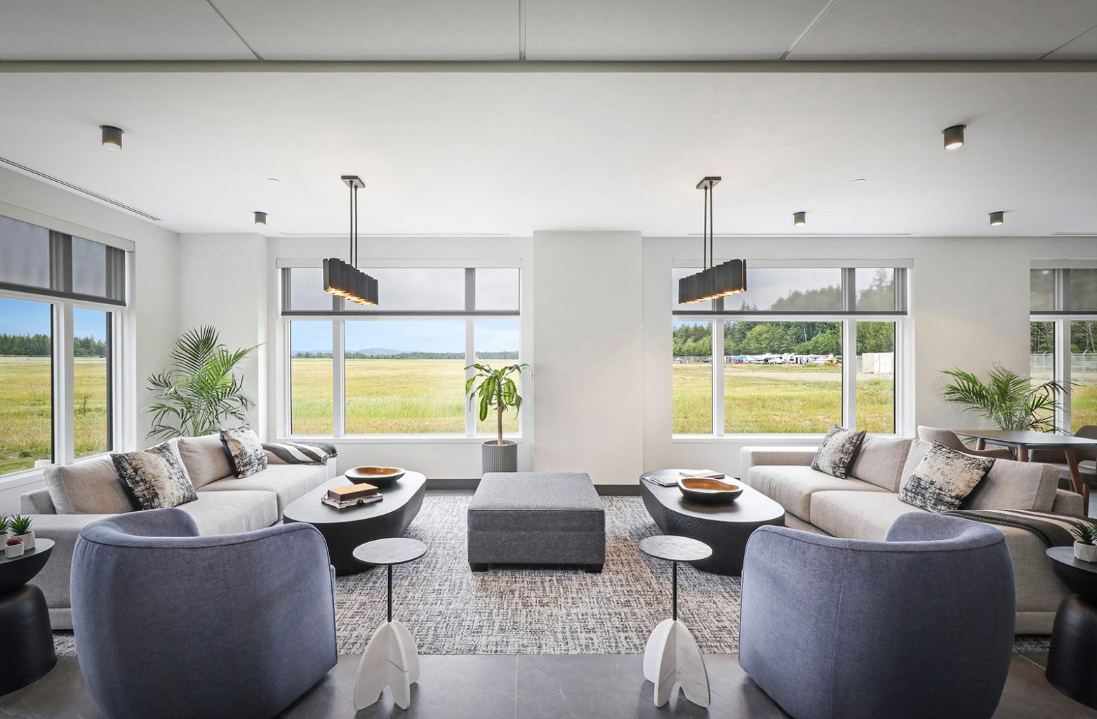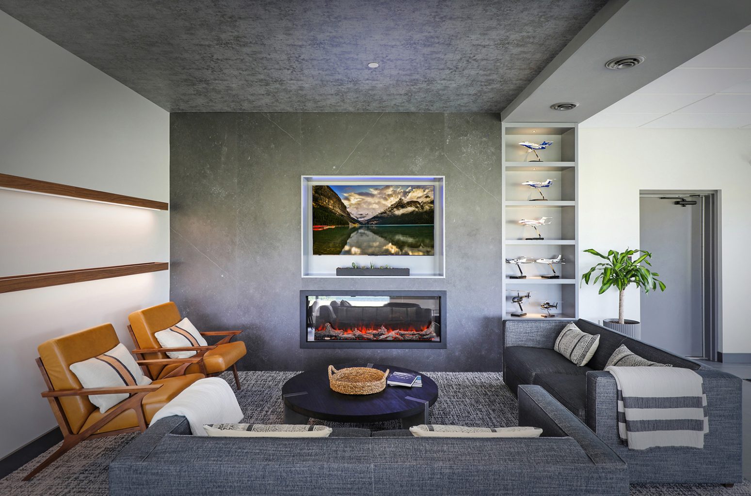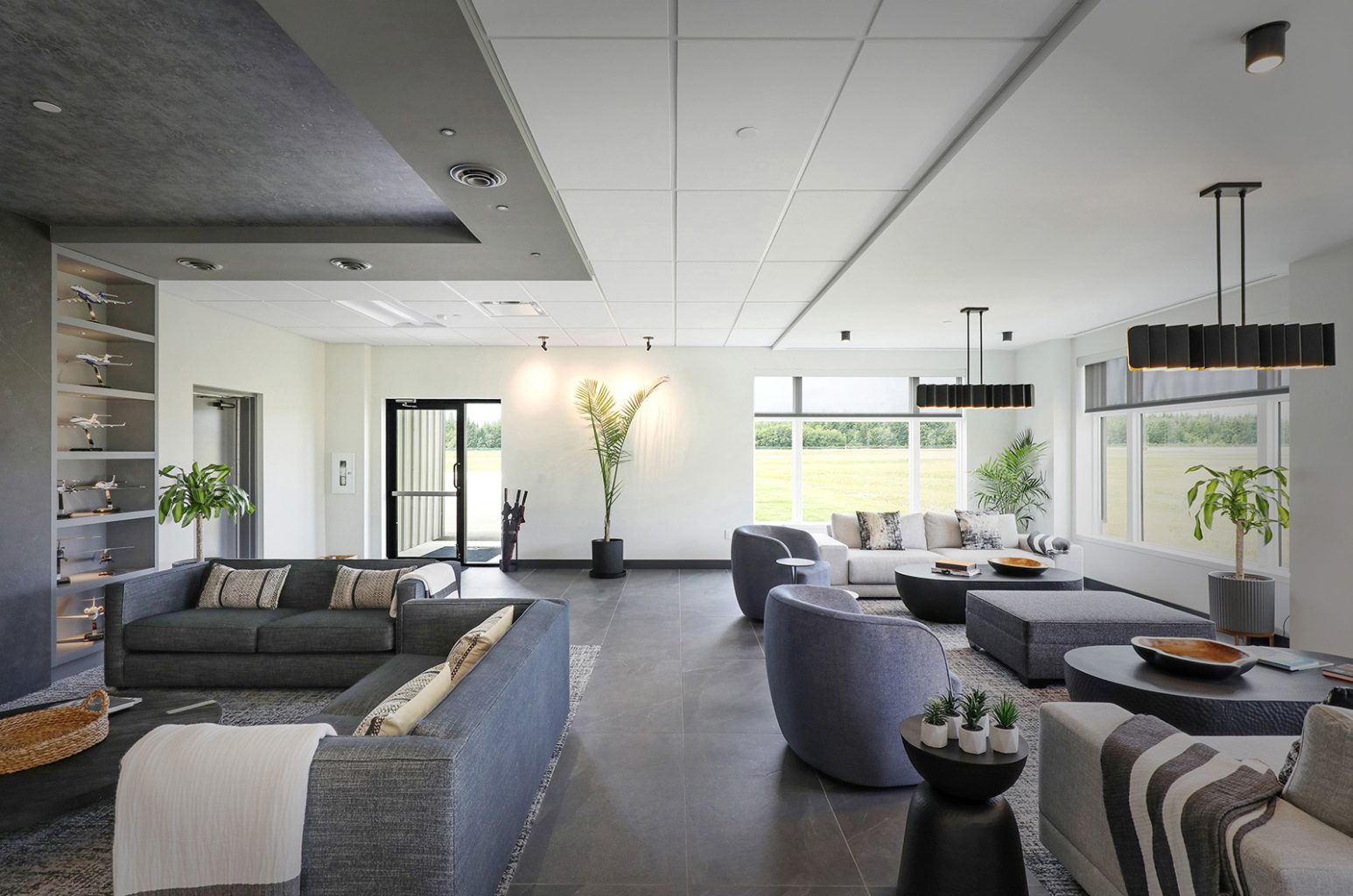 Lounge, bar, office and meeting space as part of a private airport hangar. Waiting never felt so good!