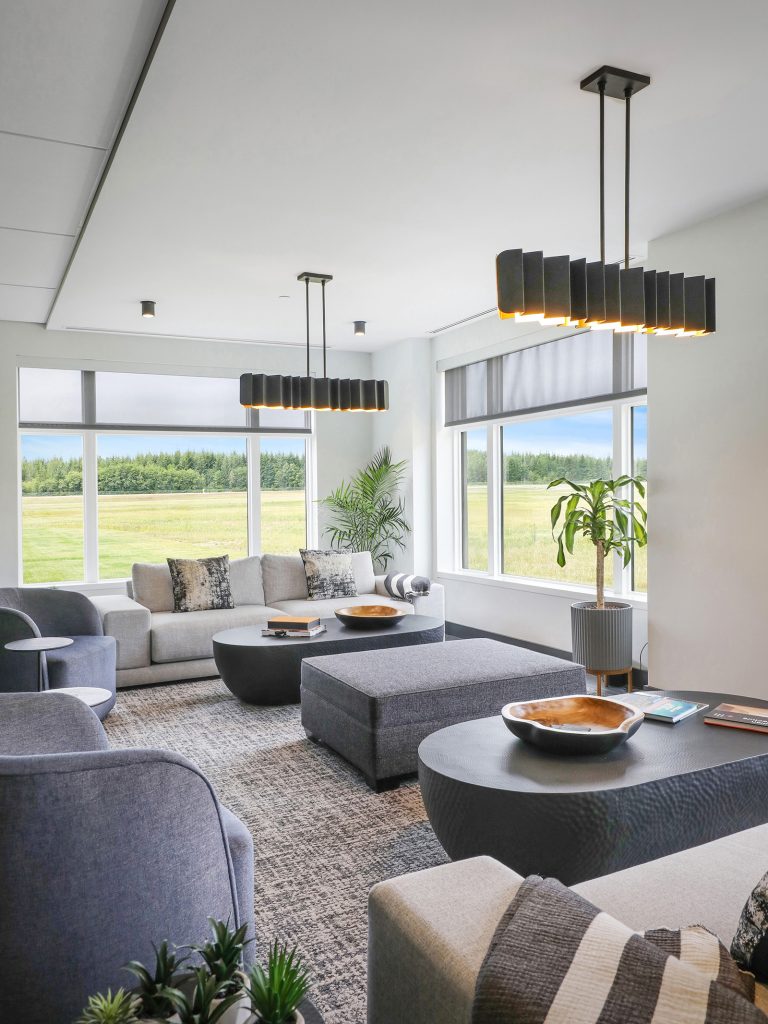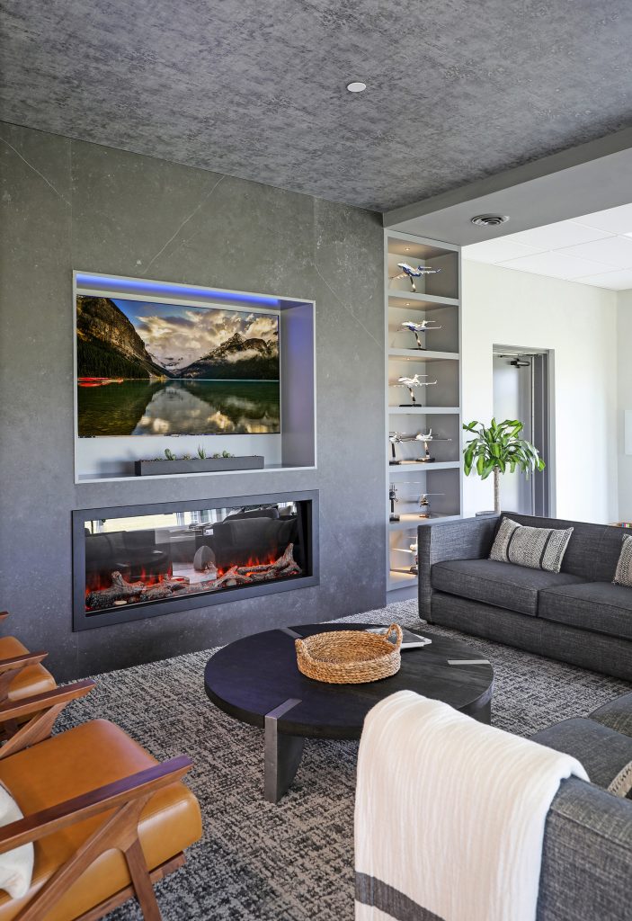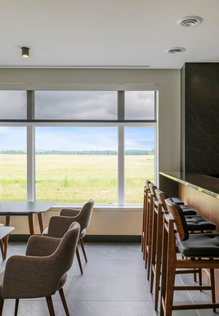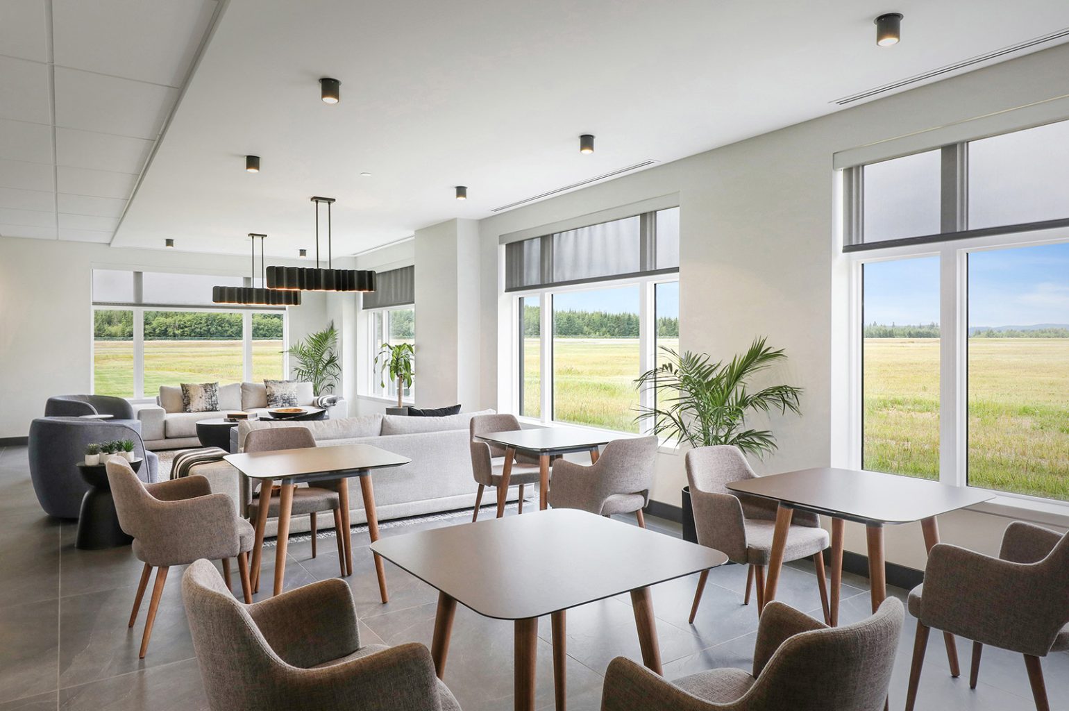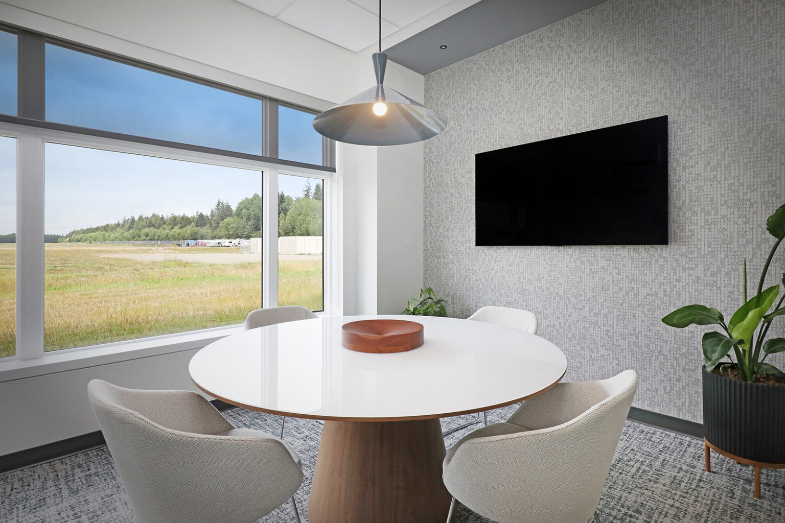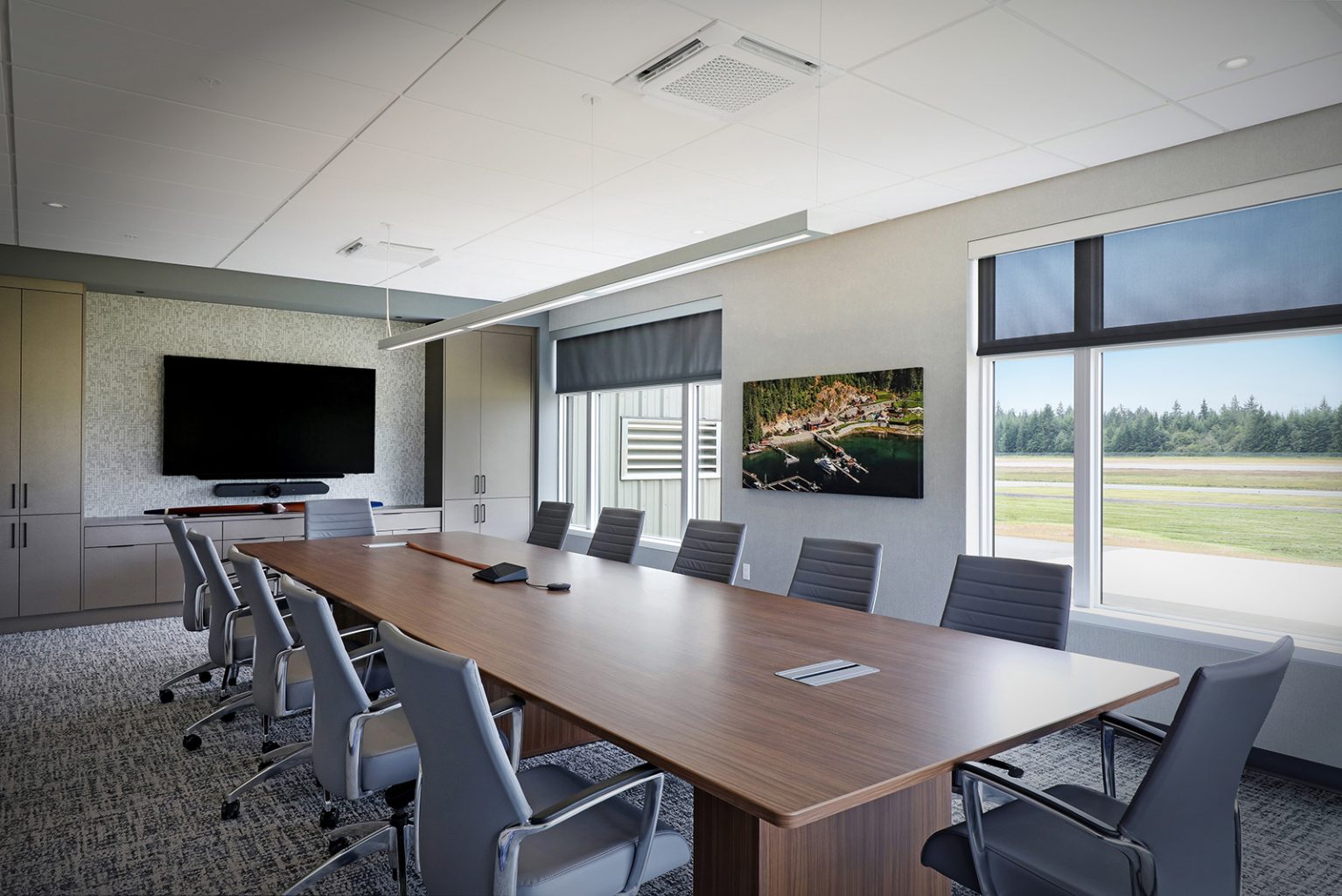 Lounge, bar, office and meeting space as part of a private airport hangar. Waiting never felt so good!